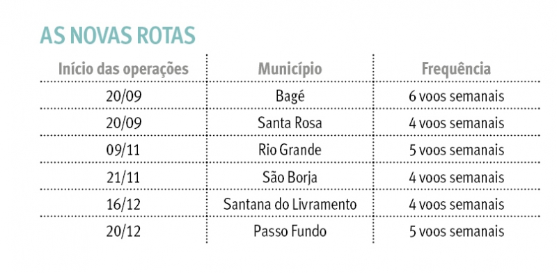 As rotas vão ligar Porto Alegre a Rio Grande, Santa Rosa, Bagé, Santana do Livramento, São Borja e Passo Fundo, com aeronaves (Cessna 208 Caravan com capacidade para nove passageiros) da empresa de táxi aéreo Two Flex.