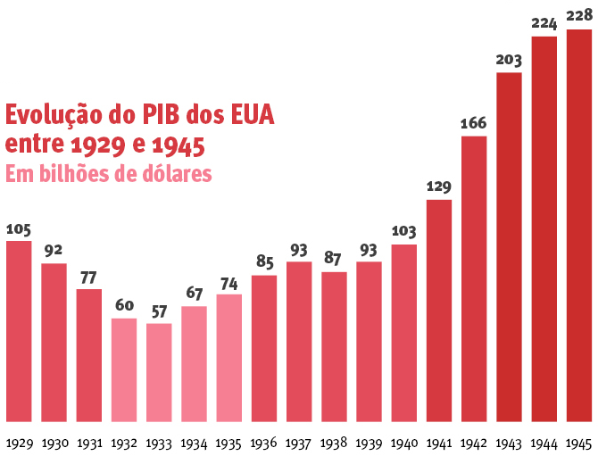 Em 1933, a produção industrial dos EUA havia caído 37% desde 1929; os preços, 33%; e o Produto Interno Bruto (PIB), 30%. O PIB norte-americano só atingiria de novo os níveis pré-crise durante a Segunda Guerra Mundial.