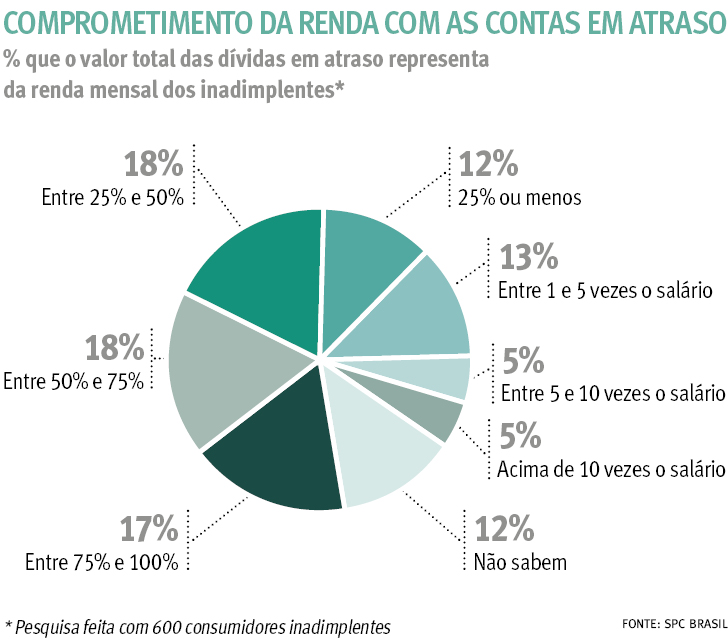 Seja qual for a definição usada, a quantidade de brasileiros nessa situação é enorme. Dos 63 milhões de inadimplentes, segundo pesquisa da SPC Brasil, 75% ficaria com o pagamento das contas básicas comprometido caso fosse quitar as dívidas em atraso. Além disso, 45% não teria condições de pagar seu endividamento em três meses, 58% tem mais de metade do salário comprometido com contas em atraso e 75% teve o padrão de vida afetado pelas dívidas.