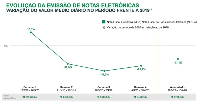 O relatório que mostra o desempenho de todos os segmentos e ainda por tipos de produtos indicou uma média de emissão diária com queda menor frente a semana anterior (28 de março a 3 de abril), que registrou média diária de R$ 1,33 bilhão.