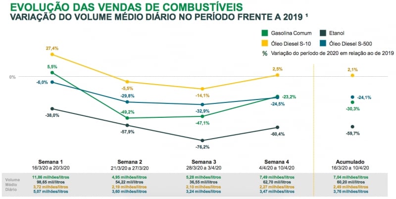 Nos postos de combustíveis, a queda na venda diária de gasolina ficou em 30% no período de quatro semanas em relação a 2019. Na última semana, o recuo ficou em 23,2%, com venda de 7,5 milhões de litros, enquanto na semana anterior havia ficado em 5,3% milhões de litros, com queda de quase 50%. O valor médio do litro continua caindo e chega a R$ 4,19. Óleo diesel segue tendo queda bem menor, com 2,5% a menos no ciclo recente. Etanol ultrapassa 60% de queda.