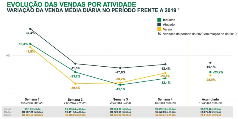 redução que chegou a quase 40%. No acumulado de quatro semanas, o valor das vendas do setor, que é o principal alvo do decreto em vigor, caiu 28%.