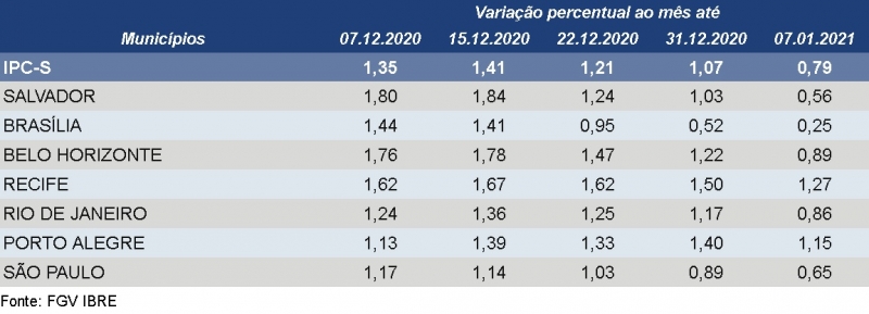 O IPC-S registrou decréscimo nas sete capitais pesquisadas e variou 0,79% segundo o levantamento divulgado nesta segunda-feira, ficando 0,28 ponto percentual (p.p.) abaixo da taxa divulgada na apuração anterior.