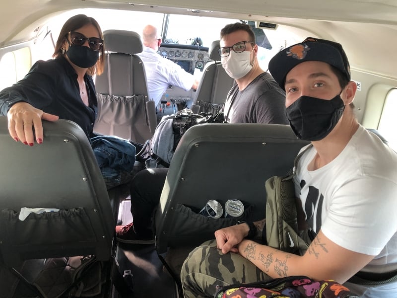 Andréa (esquerda) segurou na mão de Maurício (centro) que tem fobia de avião; Murillo também deu apoio