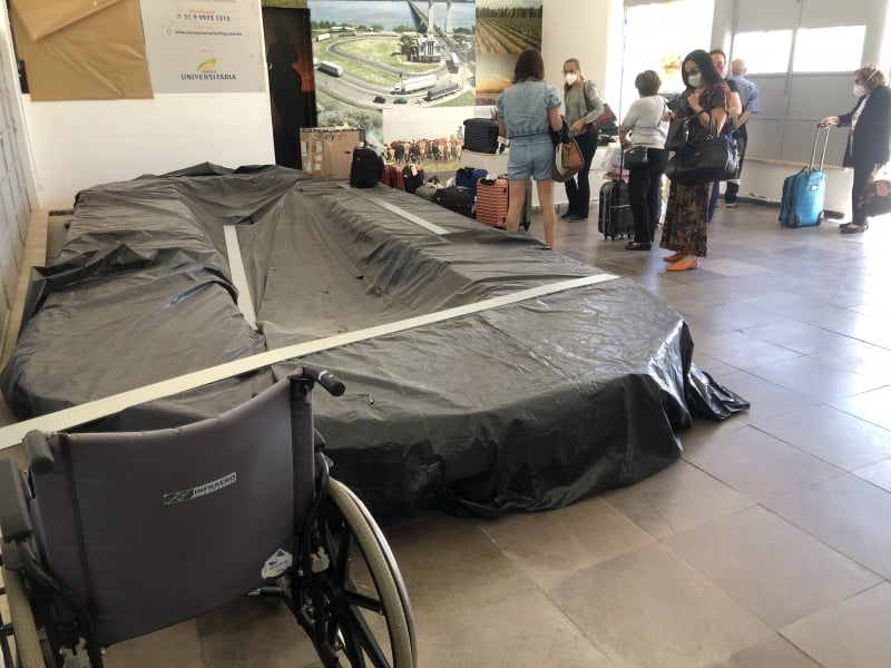 Na chegada do avião ART da Azul, com 70 assentos e quase lotado, a Uruguaiana, chama a atenção dos passageiros o equipamento de esteira de bagagem coberto por uma lona preta. Segundo o segurança que monitora a saída da área, o material deve ser montado, mas não há prazo.