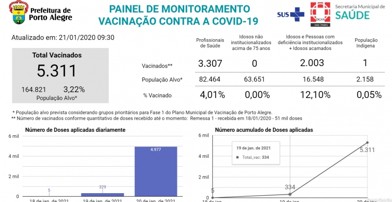 Para garantir a transparência dos dados relacionados ao enfrentamento da pandemia em Porto Alegre, a prefeitura lançou na quinta-feira (21) um "vacinômetro". Através da ferramenta será possível acompanhar a evolução da campanha de vacinação contra a Covid-19 através de dados como o número de doses aplicadas e em quais estabelecimentos de saúde. Até as 11h desta sexta-feira (22), 13.023 pessoas haviam recebido a primeira dose da Coronavac na Capital.