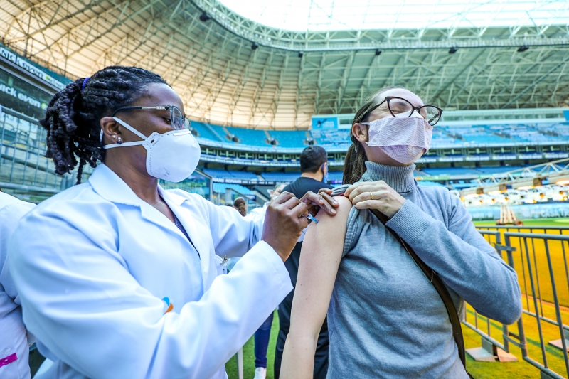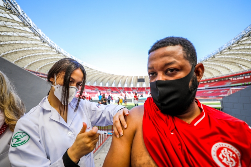 A Prefeitura de Porto Alegre aplicou 5.007 doses de vacinas contra a Covid-19 nos três pontos disponíveis neste sábado (25). Quem procurou se vacinar contra a Covid-19 na Capital teve a oportunidade de matar a saudade dos estádios Beira-Rio e Arena e ainda tirar fotos com as taças conquistadas pelos clubes. A prefeitura promoveu o Gre-Nal da Vacina, que levou a aplicação da primeira dose para pessoas com 12 anos ou mais, segunda dose de Oxford/AstraZeneca, Coronavac/Butantan e Pfizer/BioNTech e terceira dose para idosos acima de 70 anos e imunossuprimidos. Também houve vacinação no Shopping Total, na Avenida Cristóvão Colombo.