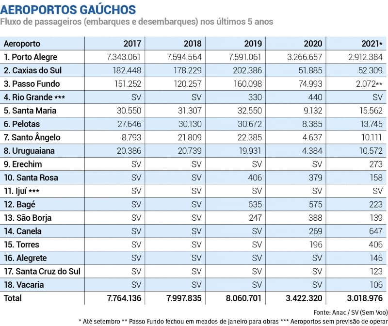 Passo Fundo teve um aumento de tráfego para novos destinos, na temporada de verão de 2020, antes da eclosão da crise da sanitária, que foi a ligação direta para Florianópolis. Outro aeroporto que saiu de cena, mas em 2013, é o de Rio Grande. O terminal estava na sexta posição em embarques e desembarques, mas entre 2010 e 2012 chegou a ser o quarto, ainda embalado pela demanda do polo naval, que foi desmontado e agora indica que pode ressurgir, com novos contratos em estaleiros.