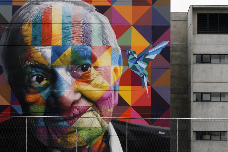 Kobra pinta rosto de Mário Quintana e dá cor a prédio de colégio em Porto Alegre