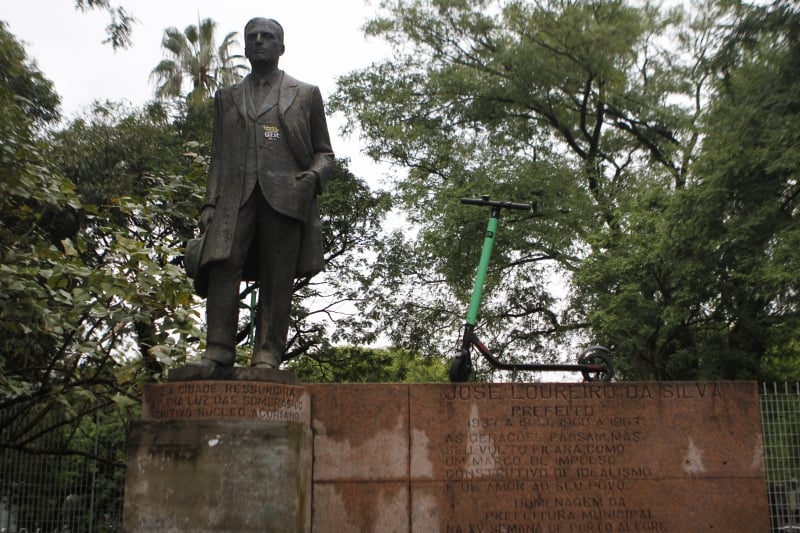 Uma cena inusitada foi flagrada pela fotógrafa do Jornal do Comércio Luiza Prado nesta terça-feira (16). No muro que compõe o monumento a José Loureiro da Silva, prefeito de Porto Alegre de 1937 a 1943 e 1960 e 1964, em frente à Câmara de Vereadores, alguém depositou um patinete da marca Grin. A dúvida é saber se foi um usuário do serviço que deixou, de propósito, o veículo no lugar ou se alguém resolveu transportar até o muro. O patinete não tem estação fixa e é deixado em qualquer ponto após a locação. Mobilidade e meios de transporte têm tudo a ver com Loureiro da Silva, lembrado até hoje por obras que imprimiram desenvolvimento e expansão da cidade, como a avenida Farrapos, que completou 80 anos, a canalização do arroio Dilúvio que permitiu a urbanização da avenida Ipiranga e o projeto urbanístico do Centro. A principal avenida da região, a Primeira Perimetral, onde fica a estátua, foi batizada com seu nome.