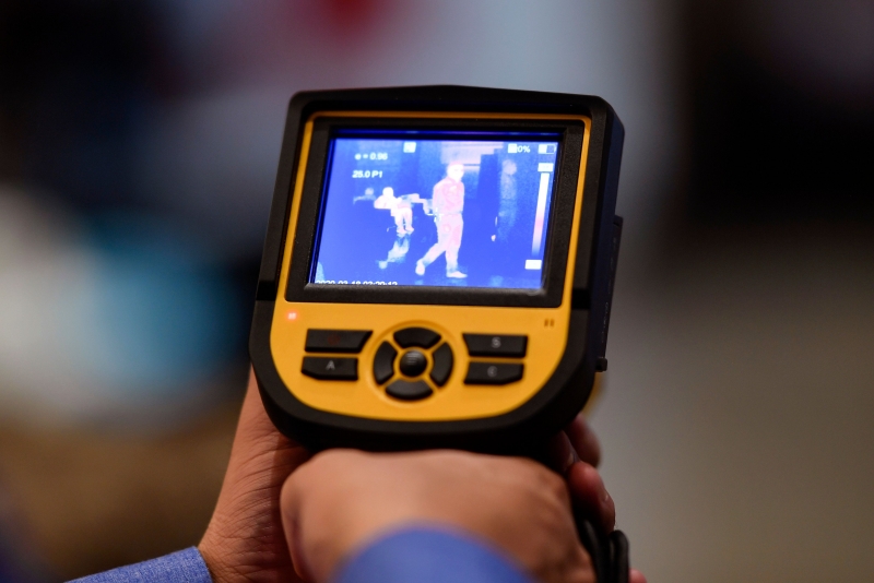 Câmera de imagem térmica, apresentada em uma feira de Belo Horizonte, ajuda a identificar imediatamente se pessoas apresentam febre. O equipamento, que auxilia na detecção de casos de coronavírus em aeroportos e hospitais, pode custar entre 30 mil e 200 mil dólares. O Corpo de Bombeiros do Distrito Federal fará a triagem de passageiros no Aeroporto Internacional de Brasília e nas rodoviárias da capital utilizando este tipo de câmera e equipamentos de análise biológica do ar. A ideia é utilizar os equipamentos em todas as aeronaves dos 25 voos internacionais que chegam ao Distrito Federal toda semana e, se necessário, em voos nacionais.