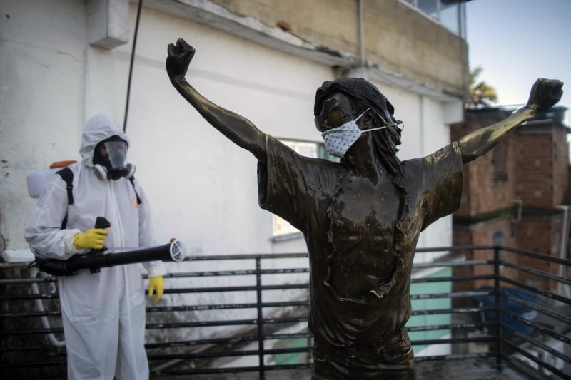 A famosa estátua do cantor Michael Jackson, no Rio de Janeiro, ganhou máscara durante a pandemia do novo coronavírus. A escultura fica na favela Santa Marta e é um ponto turístico da cidade carioca. Esta semana, voluntários desinfectaram a comunidade como forma de tentar conter a disseminação do vírus em regiões de maior vulnerabilidade e menor acesso a condições de saúde. Dados de monitoramento de pedestres, captados por câmeras espalhadas pela cidade, mostraram que o isolamento social no Rio de Janeiro chegou a 78%. As medidas de distanciamento começaram no dia 13 de março. Ainda assim, a cidade é uma das com mais casos de Covid-19 confirmados, acima de 4 mil. São quase 350 óbitos no município relacionados à doença.
