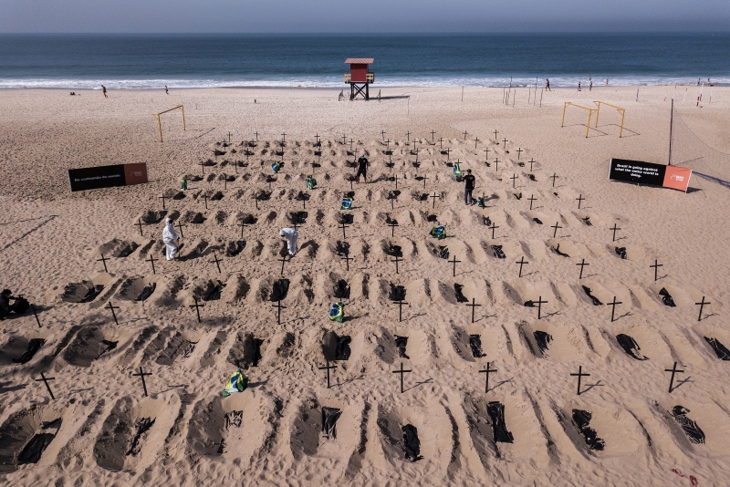 'Covas' na praia de Copacabana simbolizam críticas a ações do governo federal na pandemia