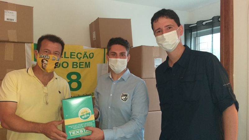 O projeto Seleção do Bem 8, ligado ao Instituto Dunga, do capitão da Seleção Brasileira de Futebol na conquista do tetra na Copa do Mundo, recebeu na tarde desta segunda-feira (26) 40 mil máscaras de proteção facial. A doação foi feita pela indústria de máscaras de proteção de Novo Hamburgo, Texstan. O projeto Seleção do Bem 8 foi criado pelo ex-jogador e um grupo de amigos em abril deste ano. O objetivo da iniciativa é apoiar comunidades carentes afetadas pelas consequências da pandemia do coronavírus. A doação foi entregue pelos representantes Felipe Ferrari (c), diretor comercial da Texstan e de Gustavo Fleck (d), diretor industrial da Texstan. A doação vai contribuir para a proteção das famílias que são atendidas pelo projeto na zona Sul de Porto Alegre.