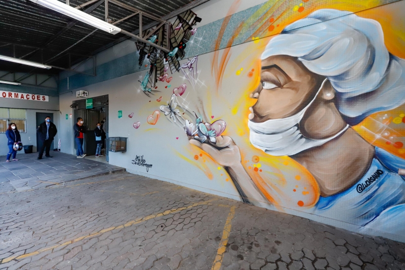 O Pronto Atendimento Cruzeiro do Sul (Pacs), conhecido como Postão da Cruzeiro, no bairro Santa Tereza de Porto Alegre, ganhou uma nova fachada nesta quarta-feira (12). A arte do grafiteiro Lucas Anão buscou criar uma imagem colorida e uma importante homenagem em meio à pandemia. A ideia de representar o carinho e comprometimento dos enfermeiros que atuam na linha de frente contra o novo coronavírus veio também como forma de agradecimento a esses profissionais. A fachada do PACS foi idealizada pelo projeto de Arquitetos Voluntários, uma instituição sem fins lucrativos que atua, desde o início da pandemia, propondo iniciativas para levar momentos de felicidade aos locais de enfrentamento à Covid. A inauguração da nova fachada reuniu as equipes de atendimento em frente ao serviço de saúde para celebrar o Dia Internacional da Enfermagem, seguindo as normas de prevenção ao Covid-19.