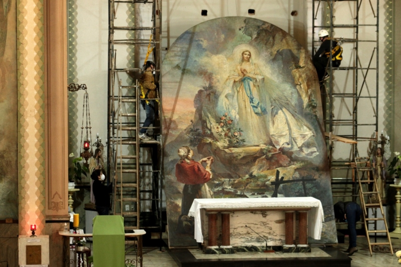 Tela 'A aparição da Virgem' é recolocada na Igreja Nossa Senhora de Lourdes