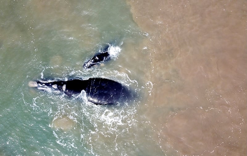 Frequentadoras tradicionais da costa do Rio Grande do Sul nesta época do ano, as baleias francas voltaram a dar show. O publicitário e fotógrafo Marcelo Langon flagrou uma mamãe e seu filhote no Balneário Tiarajú, em Tramandaí, no Litoral Norte. Langon conta que as baleias brincavam quando registrou tudo com um drone na sexta-feira (27). "Entravam e saíam da água cor marrom do mar de 'chocolatão'", descreve. Nas imagens, o contraste entre a cor mais escura e o tom verde chama a atenção. "Elas estavam nitidamente explorando as diferentes cores e se divertindo muito”, aposta o fotógrafo. Outras baleias francas também podiam ser avistadas, relata ele. O tom de chocolate da água é efeito da proliferação de algas. Apesar da calosidade na cabeça ser usada para nomear cada animal, Langon preferiu o cenário: mamãe baleia virou Chocolatão e o filhote, um macho, Chocolate.