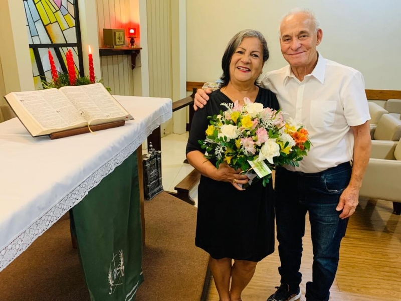 A condição circunstancial de saúde não impediu que o amor e o companheirismo, cultivados ao longo de 50 anos, fossem renovados por Gervásio e Francisca Ferreira dos Santos (foto). As bodas de ouro do casal de Canoas foram celebradas no último sábado (4) na capela do Hospital Moinhos de Vento, instituição onde Gervásio, professor de 73 anos, está internado para o tratamento de uma leucemia linfocítica crônica. A cerimônia teve direito a bolo, troca de alianças e a tradição do buquê (que foi lançado para as profissionais do hospital), e foi acompanhada pelos três filhos do casal. A iniciativa envolveu toda a equipe do hospital, inclusive a Pastoral, e foi organizada pela enfermeira Luisa Pavinatto, com supervisão da enfermeira Elisandra Leites. Emocionada, Francisca disse estar muito grata ao poder comemorar uma data tão especial ao lado de seu companheiro de vida. Já Gervásio agradeceu a dedicação, o carinho e a responsabilidade da “turma da enfermagem”, como definiu.