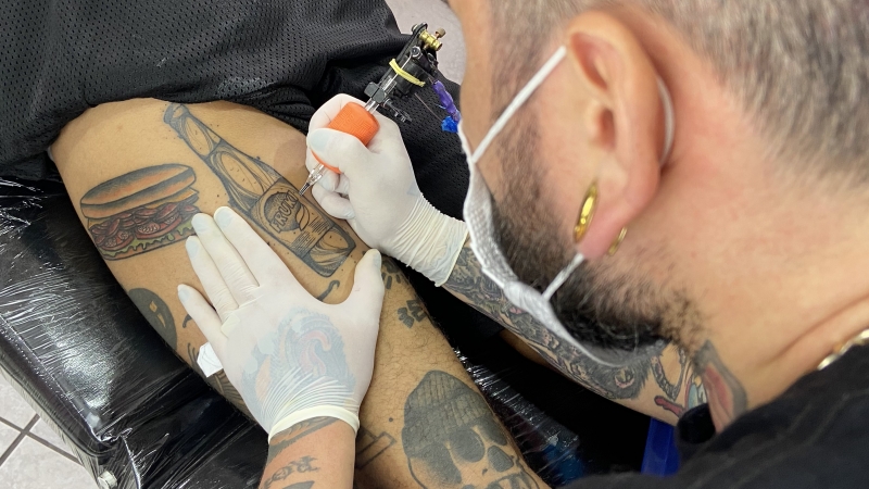 O tatuador Vinicius Viana registrou na pele a sua paixão pelo Fruki Guaraná. Com a tradição de tomar os guaranás da marca na hora de comer lanches como um xis, Viana decidiu eternizar em seu corpo o prazer de beber o refrigerante. "Fruki desde sempre esteve presente na minha vida, antes era muito mais fácil encontrar elas em garrafa de vidro, hoje em dia são poucos lugares que tem. O sabor do refri de garrafa é sempre melhor. Tinha recém feito um xis calabresa na perna e do lado tinha um espaço para completar", diz Vinicius. A obra foi realizada pelo amigo Marco Silveira, do studio Origem Tattoo, de São Leopoldo. Apreciadores da marca gaúcha, a dupla levou às pontas do lápis e da agulha uma garrafa de vidro vintage, com rótulo dos anos 2000.