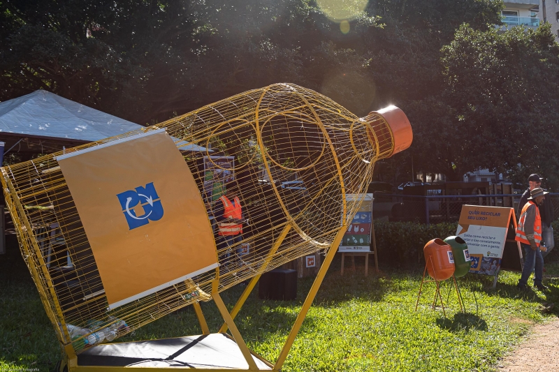 O Departamento Municipal de Limpeza Urbana (DMLU) realizou uma ação de sensibilização para o descarte correto de resíduos neste sábado (21) na Praça Carlos Simão Arnt, popularmente conhecida como Praça da Encol, localizada no bairro Bela Vista de Porto Alegre. O espaço recebeu, das 9h às 17h, maquetes de unidade de triagem e de composteira caseira, exemplos de materiais recicláveis e um garrafão com estrutura feita em metal, o chamado Papa Resíduo (foto). Neste recipiente, a população pôde depositar seu lixo reciclável. Panfletos informativos sobre a segregação correta também foram distribuídos. A iniciativa deu prosseguimento às atividades da 17ª Semana Cidade Limpa, período anual que ocorre de 16 a 22 de maio e tem o objetivo de sensibilizar a população sobre a sua responsabilidade em manter a limpeza das ruas, praças, parques e arroios, mas também das calçadas que não são públicas.