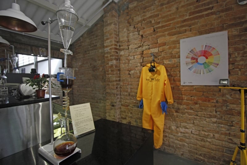 Os fãs de Breaking Bad encontram no espaço inúmeras referências, como o cardápio da casa, que é todo elaborado com elementos químicos, os copos e louças, que são instrumentos de laboratório, e, ainda, uma grande tabela periódica onde os elementos são os personagens da série. Mesmo com essas alusões, Bruno garante que a ideia é receber, também, quem não conhece o produto audiovisual. "Gosto de falar que é inspirado, e não temático, porque a ideia é não limitar só a um nicho de clientes que sejam fãs da série. A pessoa que gosta, pela fachada do negócio já vai saber, mas não queríamos que quem não gosta se sentisse deslocado. É comum que, quem não conhece a série, ache que é inspirado em química", expõe Bruno, definindo o cold brew como um processo de alquimia, o que tem tudo a ver com o universo do seriado. "Na terceira temporada, tem um link muito forte com café. O Mr. White tem uma assistente, que monta um equipamento com vidrarias químicas, e faz o café nesse equipamento. Quando o Mr. White prova, diz que é o melhor café que ele já provou na vida", conta.