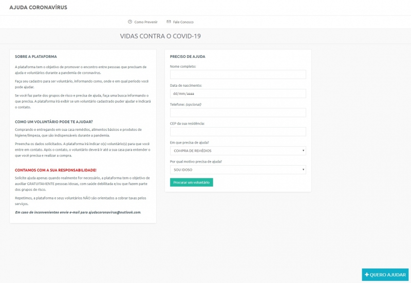 Ajuda Coronavírus, que conecta os voluntários de todo o país mais próximos dispostos a comprarem itens de necessidade básica, como alimentos, remédios e produtos de higiene e limpeza.
