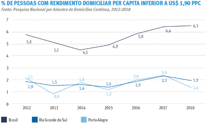 Segundo dados da Síntese de Indicadores Sociais (SIS) do IBGE, o Rio Grande do Sul é o terceiro estado com menor desigualdade, logo atrás do Distrito Federal, em segundo lugar, e de Santa Catarina, em primeiro. A pesquisa mostrou que o índice de habitantes abaixo da linha de extrema pobreza chegava a 218 mil em 2018. Em comparação com 2012, o percentual de miseráveis é exatamente igual: 1,9% da população vive com menos de US$ 1,90 por dia. O recorde do Rio Grande do Sul foi em 2017, quando 2,4% da população estava abaixo da linha da extrema pobreza.