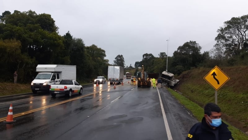 Atualizada às 12hç03min de 27/07/2021 -Subiu para duas vítimas fatais no acidente com caminhão e um carro na madrugada desta terça-feira (27) na BR-386, em Triunfo, na região Metropolitana de Porto Alegre (RMPA), causa bloqueio parcial das pistas.
