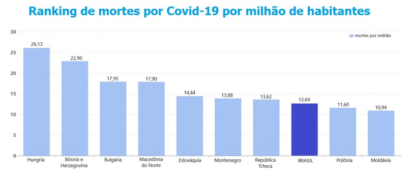 No acumulado desde o início da pandemia, o país com maior número de mortes per capita é a República Checa, com taxa de 2.526,57 mortes por milhão de habitantes, seguida por San Marino (2.475,10 mortes por milhão) e Hungria (2.269,90 mortes por milhão). No ranking de todo o período de pandemia mundial, o Brasil aparece na 18ª colocação, com índice de 1.565,45 mortes por milhão de habitantes.
