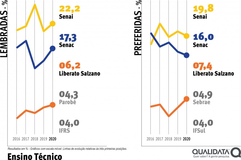 Na preferência, a pesquisa feita pela Qualidata confirma a liderança do Senai nesse setor, recebendo 19,8% das indicações dos gestores gaúchos. Senac permanece na segunda colocação, com 16%. Liberato Salzano também sobe para a terceira posição entre as preferidas, com 7,4%.