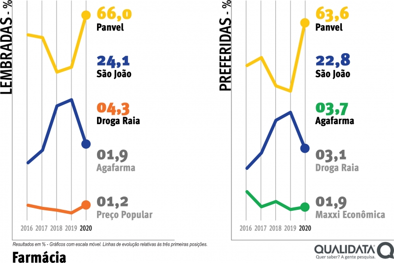 A Panvel saltou para 66,0% na lembrança e foi a 63,6% na preferência, ficando mais de 40 pontos percentuais à frente da São João.