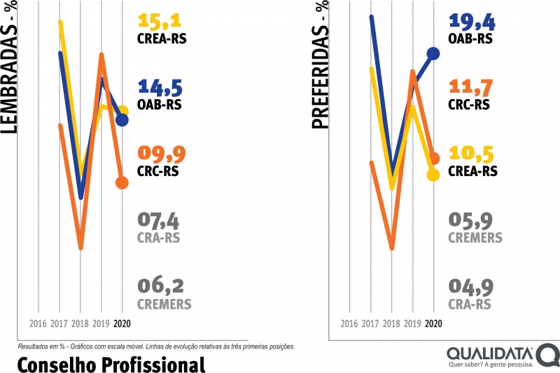 Depois de terem perdido a primeira posição para o CRC-RS no levantamento anterior, o CREA-RS e a OAB-RS voltam a aparecer na frente na categoria Conselho Profissional. O CREA-RS praticamente repetiu a pontuação anterior como marca mais lembrada com 15,1%. Ficou em primeiro lugar, porque a OAB-RS (14,5%) e o CRC-RS (9,9%) perderam mais pontos nesse quesito, caindo para a segunda e terceira posições, respectivamente.