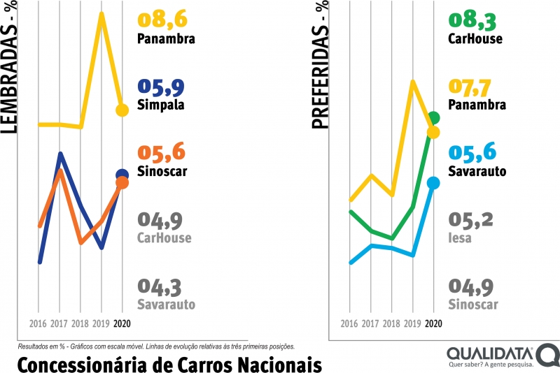 A pesquisa feita pela Qualidata revela uma mudança de posições na avaliação da preferência nessa categoria. Quem subiu para o primeiro lugar nesse quesito foi a CarHouse, que saltou de 4,6% para 8,3%, ultrapassando a Panambra por apenas seis décimos de ponto percentual.