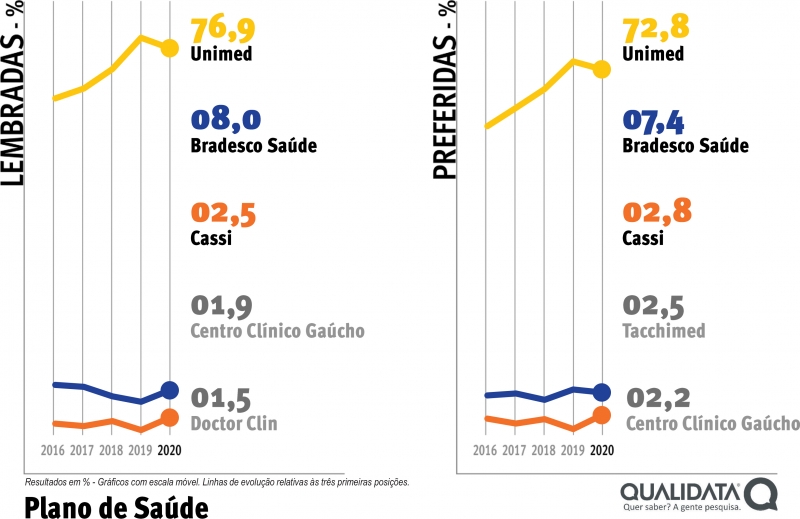 Foi muito pequena a variação nos números da Unimed, como marca de plano de saúde. Confirmando sua absoluta liderança no setor, oscilou de 79% para 76,9% na lembrança e de 74,4% para 72,8% na preferência.
