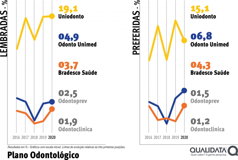 A pesquisa executada pela Qualidata revela que a Uniodonto teve uma oscilação um pouco maior na aferição dos níveis de preferência. Perdeu pouco mais de três pontos percentuais, baixando de 18,4% para 15,1%. Apesar disso, sua liderança absoluta do setor está mantida, considerando a grande vantagem de pontuação que possui em relação ao segundo lugar, ocupado pela Odonto Unimed.