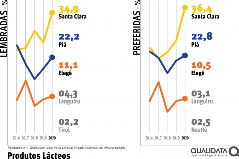 Depois de ter perdido pouco mais de três pontos percentuais como marca mais lembrada, a Santa Clara conquista 9,4 pontos percentuais e sobe para 34,9%, ampliando a sua vantagem como marca líder na categoria Produtos Lácteos.