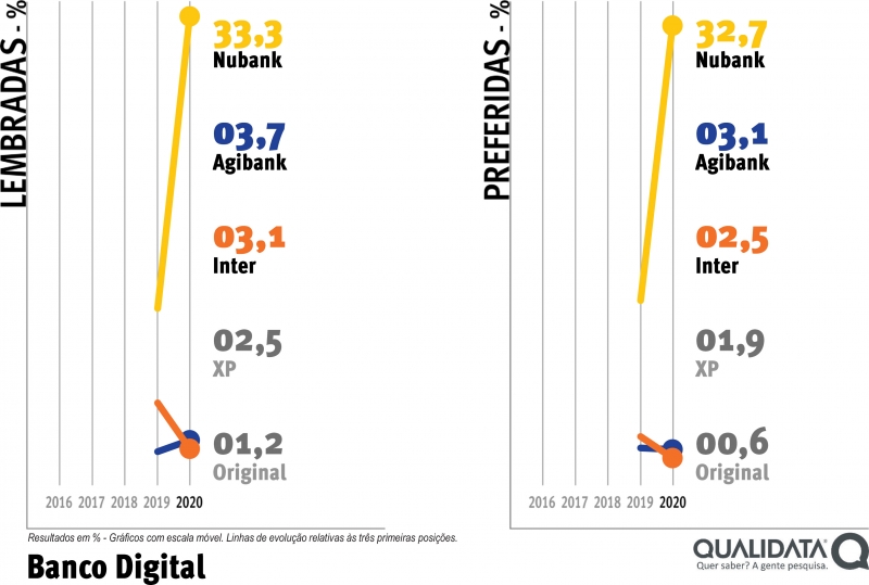 Este setor foi uma das novidades introduzidas na edição anterior do projeto Marcas de Quem Decide. Agora, no segundo levantamento feito pela Qualidata, a marca Nubank aparece com índices ainda maiores nos dois quesitos avaliados na pesquisa. Saltou para 33,3% como marca mais lembrada e foi a 32,7% como a preferida do setor. Esses resultados ampliaram de forma expressiva a vantagem sobre o segundo lugar, que, agora, é ocupado pela marca Agibank.