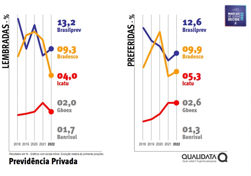 Depois de três anos dividindo o primeiro lugar com Bradesco, Brasilprev volta a ser líder do setor. A pesquisa feita pela Qualidata revela que isso se deve mais à variação sofrida pelo Bradesco na avaliação da lembrança do que ao crescimento da marca líder. Enquanto o Brasilprev subiu um ponto percentual e totalizou 13,2% das indicações, o Bradesco decresceu de 14,5% para 9,3% e passou ao segundo lugar.
