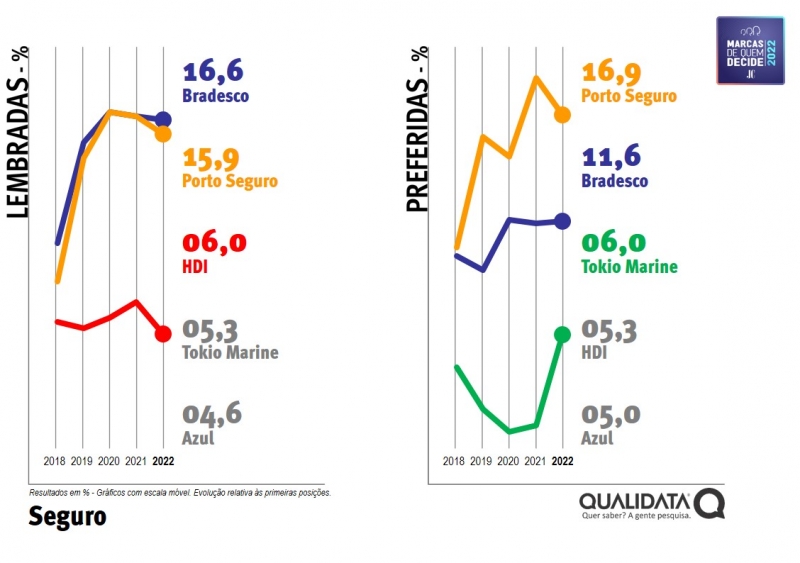 De maneira geral, os primeiros colocados no setor de Seguro sofreram quedas nos resultados, com exceção do Bradesco que praticamente repetiu o índice na preferência. Ainda assim, ocorreram poucas mudanças. Bradesco e Porto Seguro, que empataram numericamente nas últimas duas edições, agora estão separados por 7 décimos de ponto percentual. Com 16,6%, o Bradesco levou vantagem sobre a Porto Seguro, que marcou e 15,9%. Os novos resultados descaracterizam o empate numérico, mas definem o empate técnico. O terceiro lugar na lembrança permanece com a HDI, indicada por 6,0%. No lado da preferência, Porto Seguro permanece em primeiro lugar, com 16,9%, e Bradesco em segundo, com 11,6%. Tokio Marine, que não estava entre os cinco nomes e não aparecia no gráfico, saltou para 6,0% e tomou o terceiro lugar da HDI, que oscilou para 5,3% e caiu uma posição.