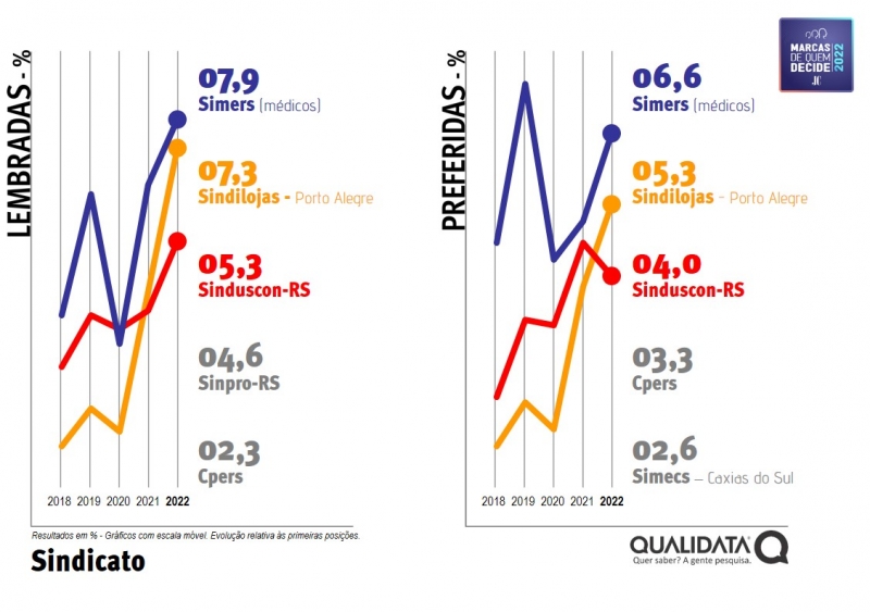 Em razão do propósito muito abrangente, os entrevistados podem responder aos quesitos de lembrança e preferência citando nomes de sindicatos de quaisquer categorias. Por isso, os resultados obtidos podem ser variáveis. Com exceção do primeiro lugar na avaliação da lembrança, que segue ocupado pelo Simers com 7,9%, e do terceiro na preferência, pelo Sinduscon com 4,0%, as demais posições sofreram alteração.
