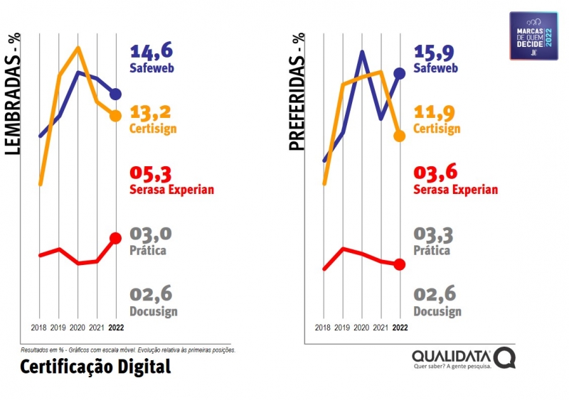 Os novos números indicam uma vitória matemática da Safeweb em relação à Certisign, mas mantêm as marcas empatadas tecnicamente. Desde a inclusão desse setor nas pesquisas da Qualidata, em 2017, ambas vêm trocando as posições com frequência e mantendo os índices sem grandes distanciamentos, o que legitima a disputa acirrada pela liderança.