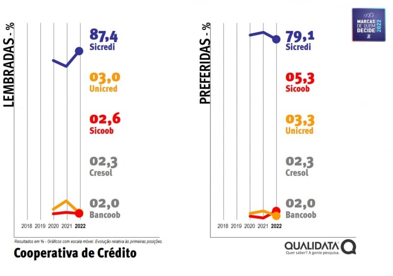 Os novos números não só reafirmam a posição de liderança absoluta e isolada do Sicredi, como também representam a conquista do primeiro maior nível de dominância verificado entre todas as categorias que integram a pesquisa da Qualidata nessa edição. Ao todo, cinco marcas foram citadas pelo público entrevistado.
