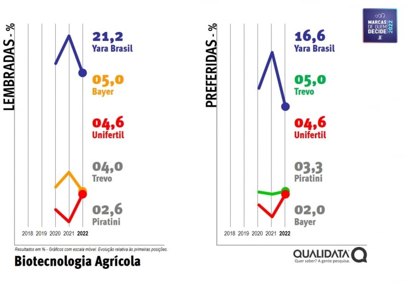 A inclusão do setor de Biotecnologia Agrícola no projeto Marcas de Quem Decide ocorreu em 2020. Desde então, a Yara Brasil mantém isoladamente a liderança, ainda que tenha apresentado pequena oscilação nesta 24ª edição. À frente das outras 12 marcas citadas, foi lembrada por 21,2% dos gestores entrevistados e indicada como preferida por 16,6% deles.