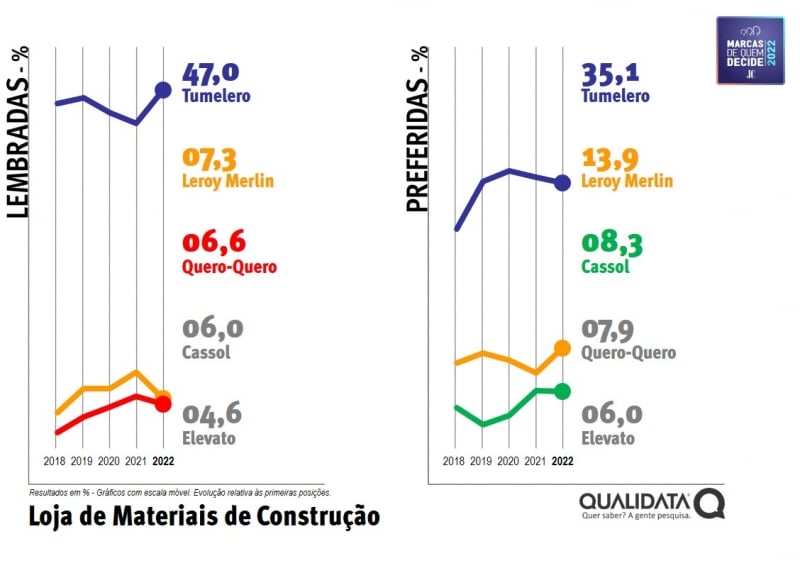 Depois de três anos em recuo, Tumelero volta a progredir enquanto marca mais lembrada. Saltou de 42,7% para 47,0%, reafirmou a liderança e abriu ainda mais vantagem em relação à segunda colocada, Leroy Merlin, que oscilou para 7,3%. A Quero-Quero perdeu 1 ponto percentual e se manteve na terceira colocação da lembrança, com 6,6%.