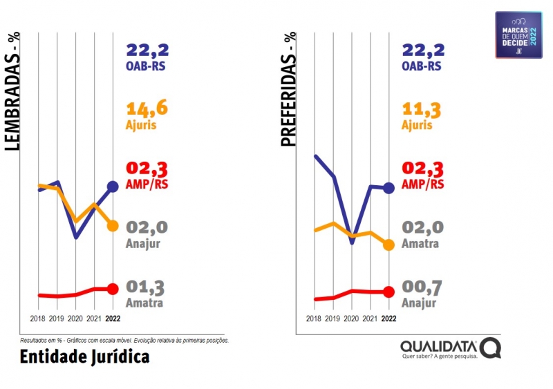 A recuperação na preferência vista no levantamento anterior foi mantida pela OAB-RS, que atingiu 22,2% nesta 24ª edição do projeto Marcas de Quem Decide. São praticamente 10 pontos percentuais à frente da Ajuris, segunda colocada com 11,3%.