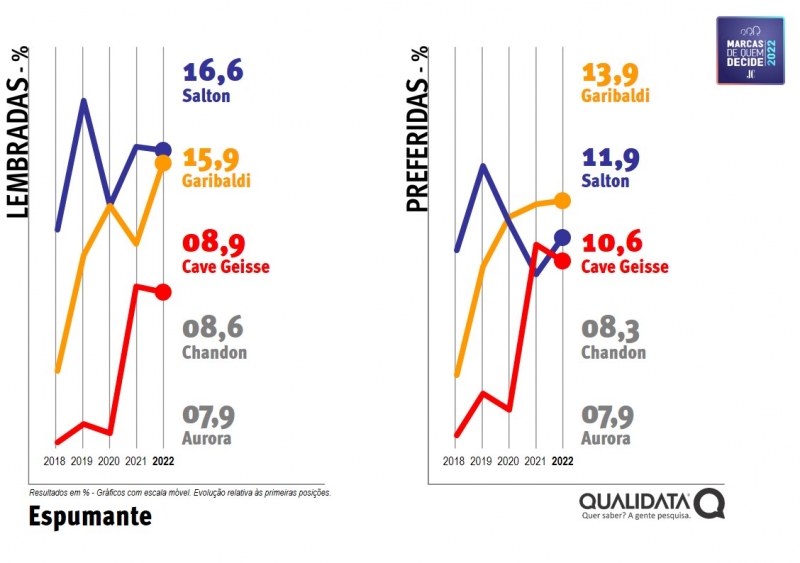 Com praticamente os mesmos índices apresentados na pesquisa anterior da Qualidata, realizada em 2021, Salton continua sendo a marca de Espumante mais lembrada pelo público entrevistado. A marca Garibaldi segue sendo a preferida.