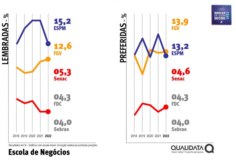 O Senac ganhou pontos e passou à terceira colocação nos dois lados da pesquisa, com 5,3% na lembrança e 4,6% na preferência.