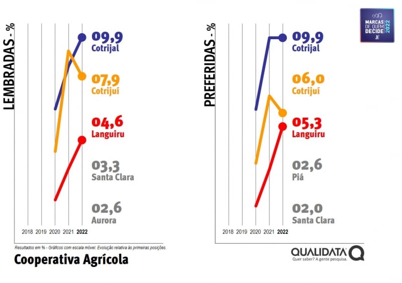 A Cotrijuí oscilou de 9,2% para 7,9% na lembrança e de 6,9% para 6,0% na preferência, passando a ocupar o segundo lugar em ambos os quesitos. Em terceiro, a Languiru, com 4,6% na lembrança e 5,3% na preferência.