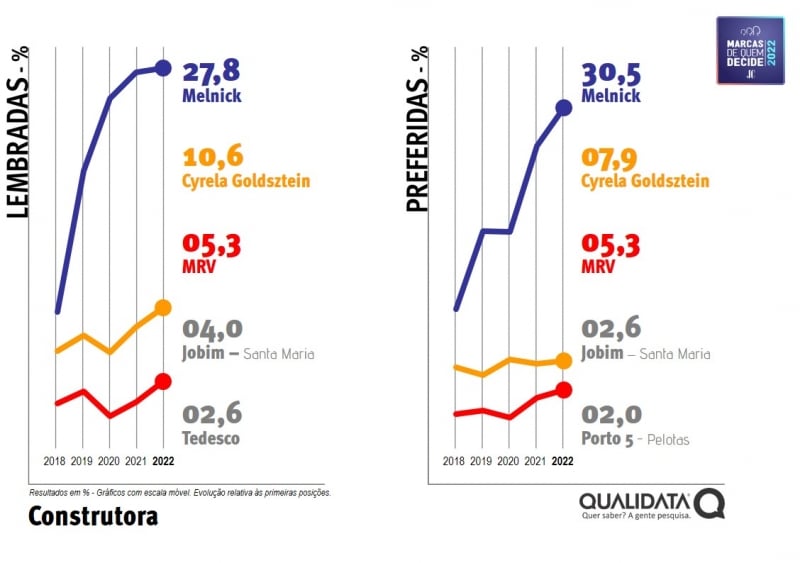 Mais uma vez, a Melnick foi a marca de grande destaque do setor na pesquisa realizada pela Qualidata. Sendo lembrada por 27,8% do público pesquisado e indicada como preferida por 30,5% dele, ela conserva seu lugar com folga. Na lembrança, a Melnick está 17,2 pontos percentuais adiante da segunda colocada, Cyrela Goldsztein, que totaliza 10,6% dos votos nesta 24ª edição do projeto Marcas de Quem Decide.