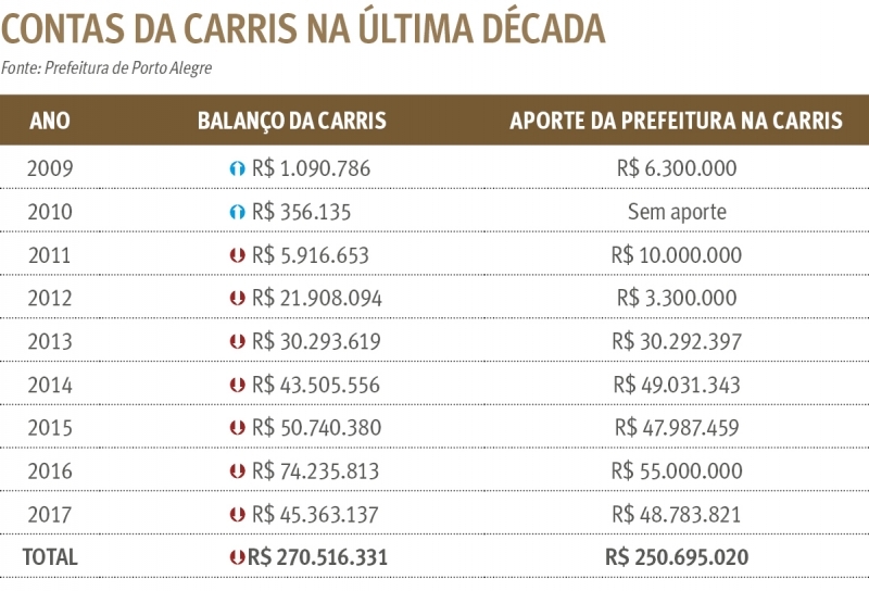 Embora a prefeitura tenha dúvidas sobre o funcionamento da Carris, sabe de uma coisa: a empresa tem apresentado sucessivos déficits desde 2011 - cuja soma dos balanços deficitários acumula R$ 271,9 milhões. No mesmo período, a prefeitura aportou R$ 244,3 milhões na Carris. Tanto Marchezan quanto Vanuzzi bateram bastante nessa tecla.